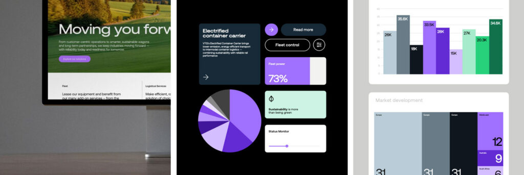 Diese Beispiele zeigen, wie die neue Farbwelt von VTG in der Praxis funktioniert. Sie sorgt für klare Strukturen, gute Lesbarkeit und einen starken visuellen Eindruck – von digitalen Anwendungen über Datenvisualisierungen bis hin zur Kommunikation.